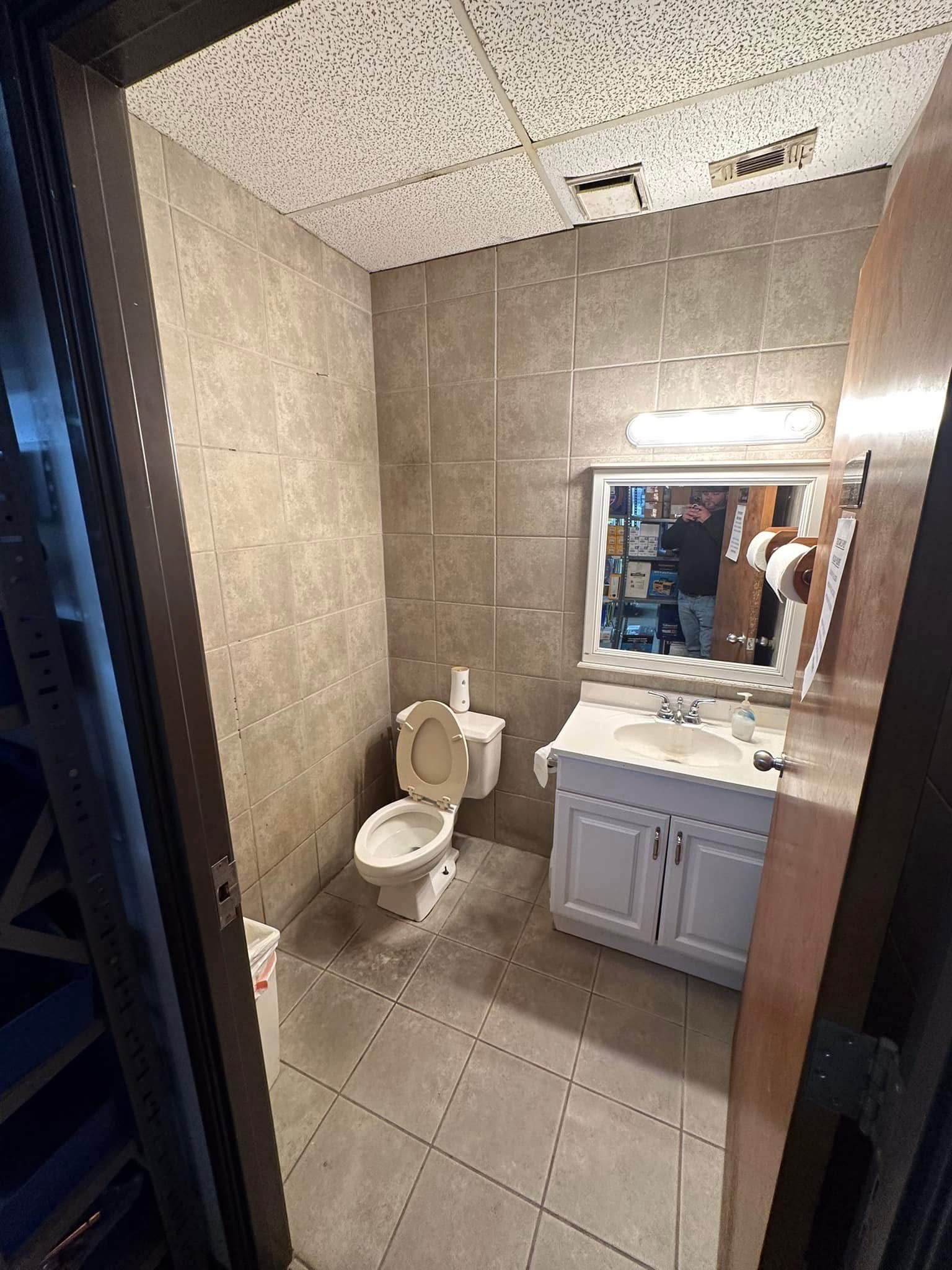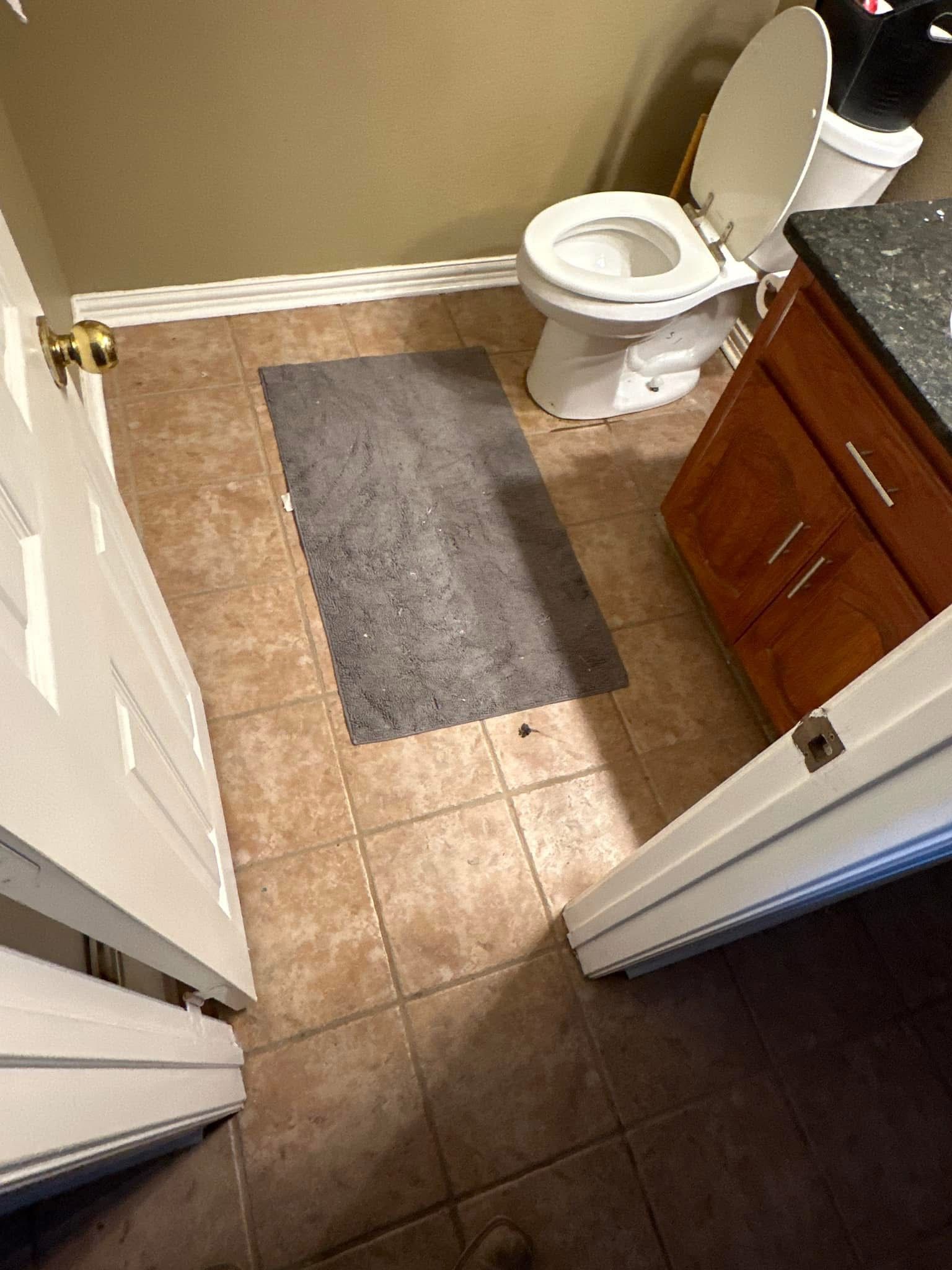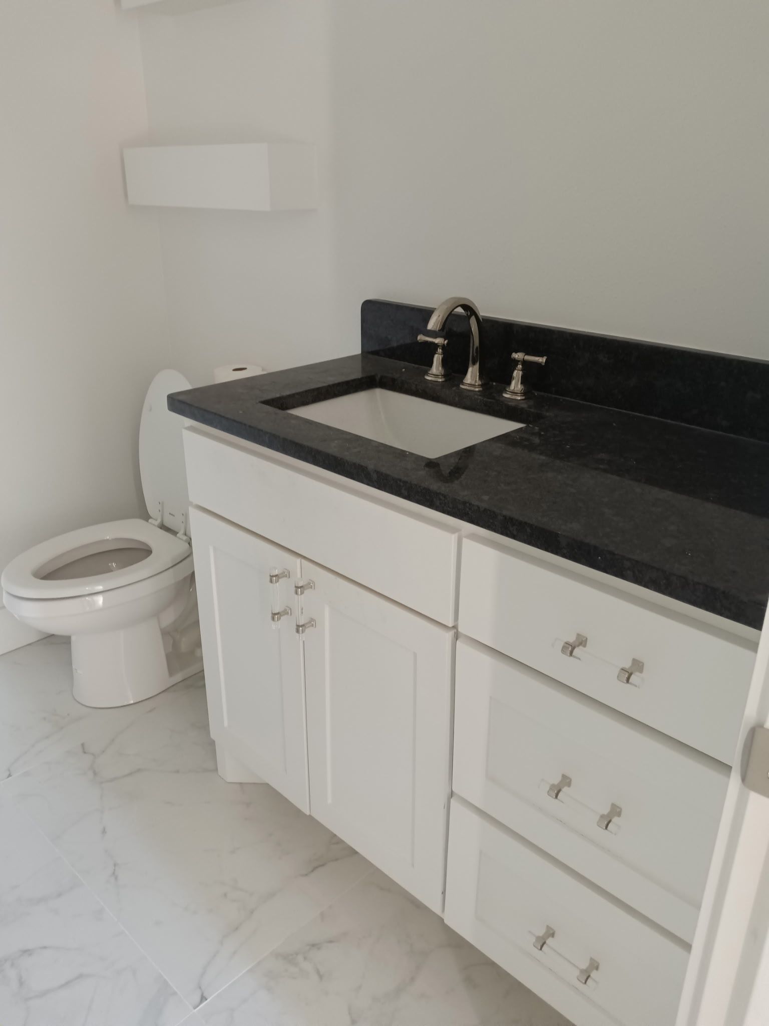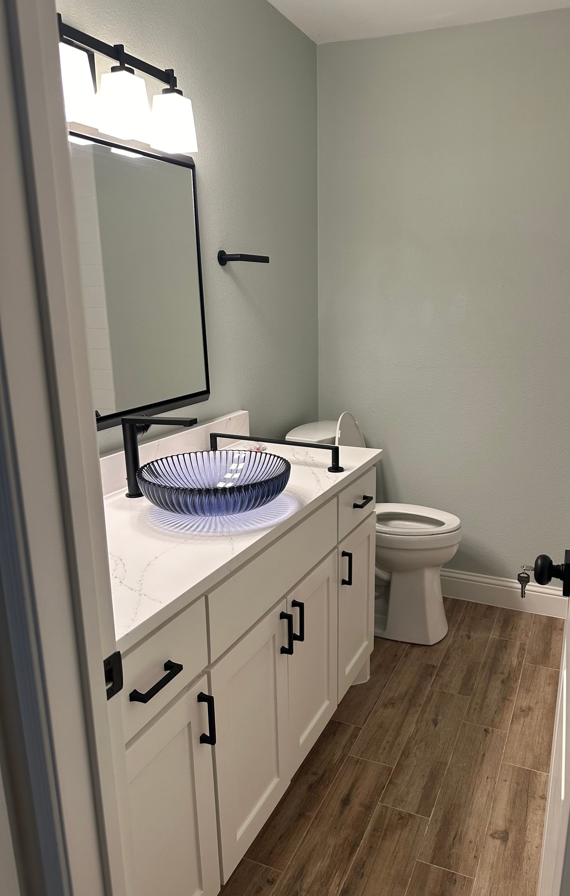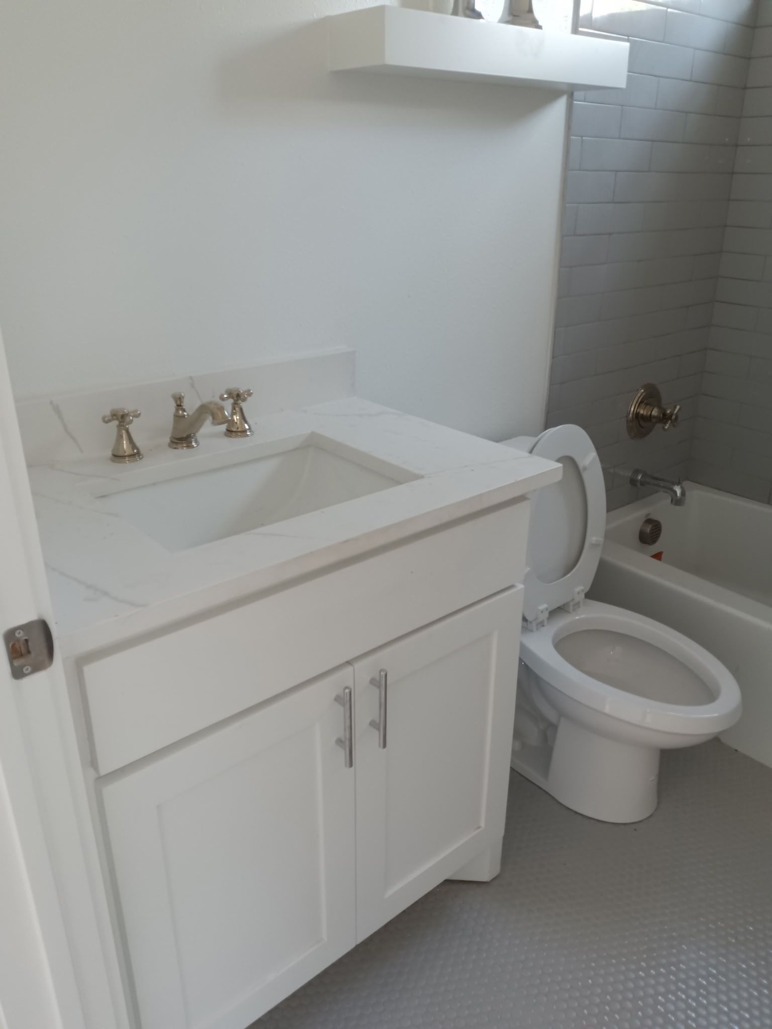Bathroom renovation: before and after shots. White walls, new sink cabinet, and updated fixtures.