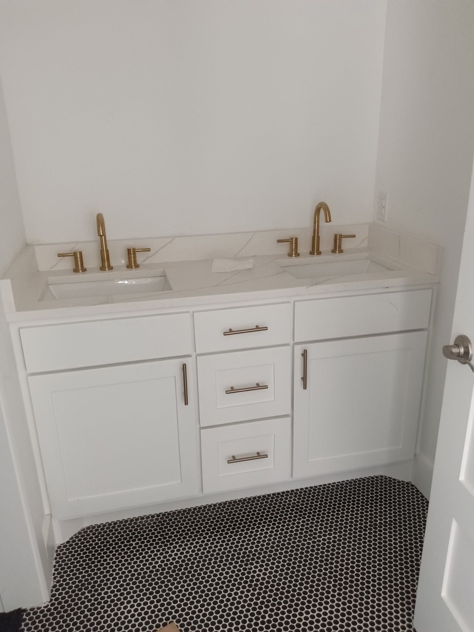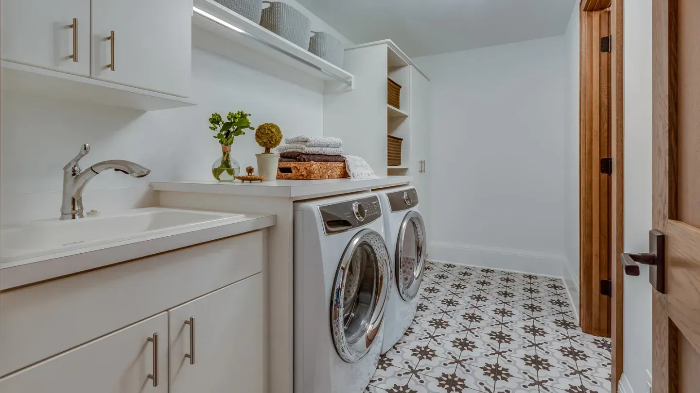 White cabinet with a utility sink and granite countertop, next to a patterned tile floor.