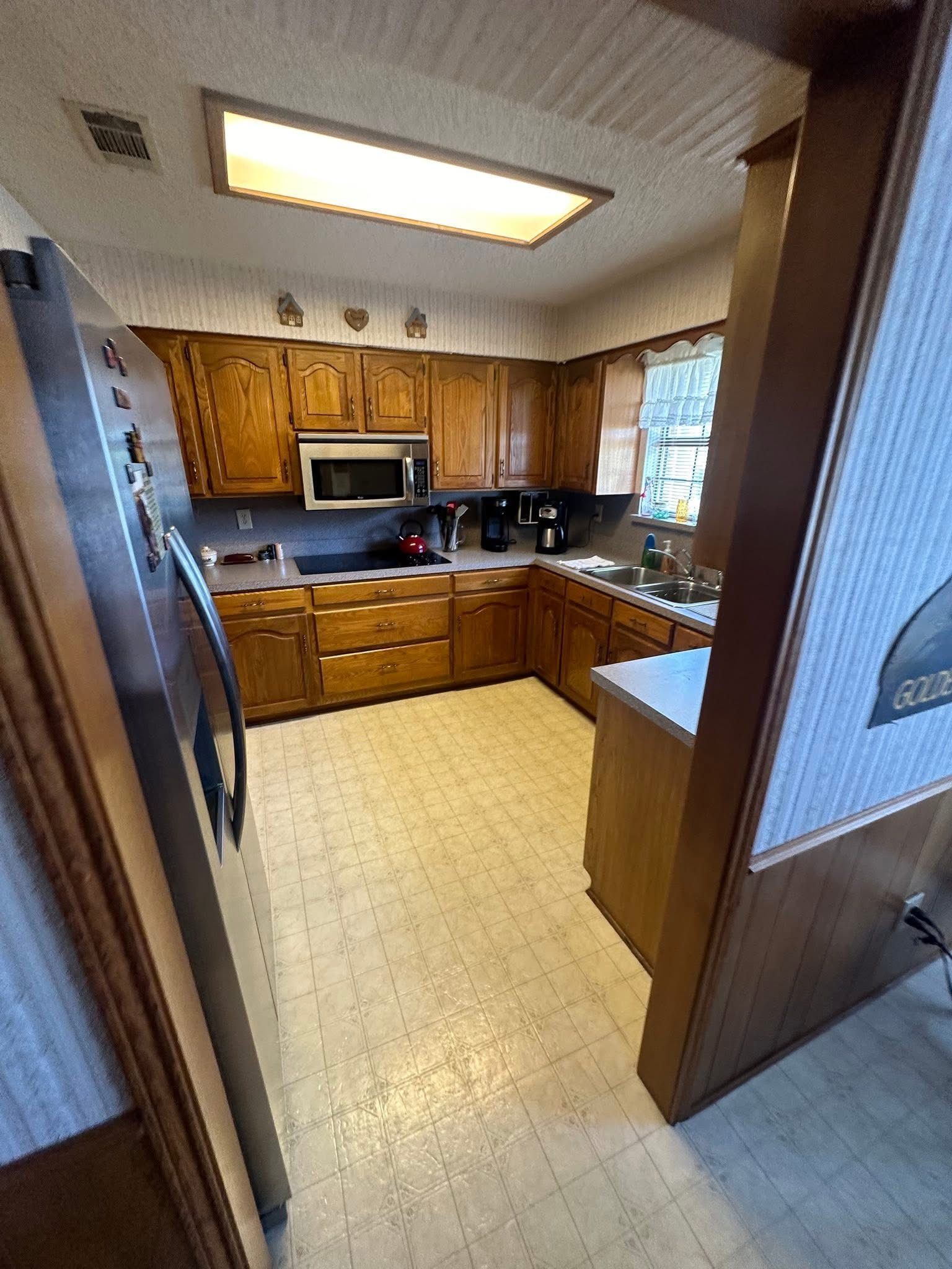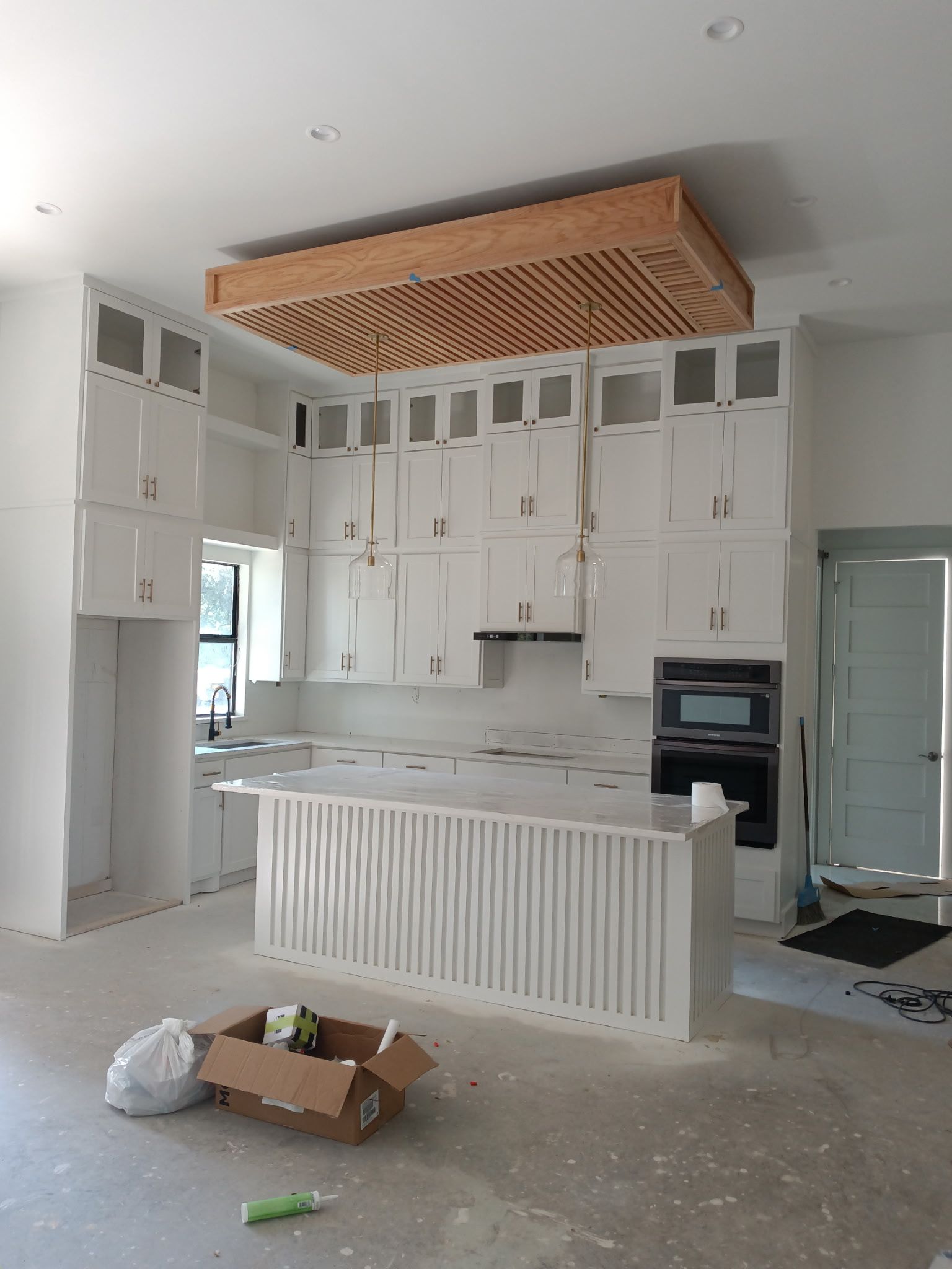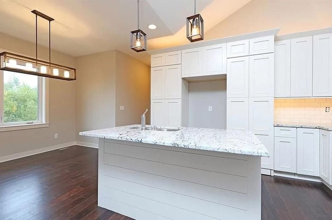 White kitchen with island, cabinets, stainless steel refrigerator, and stovetop.