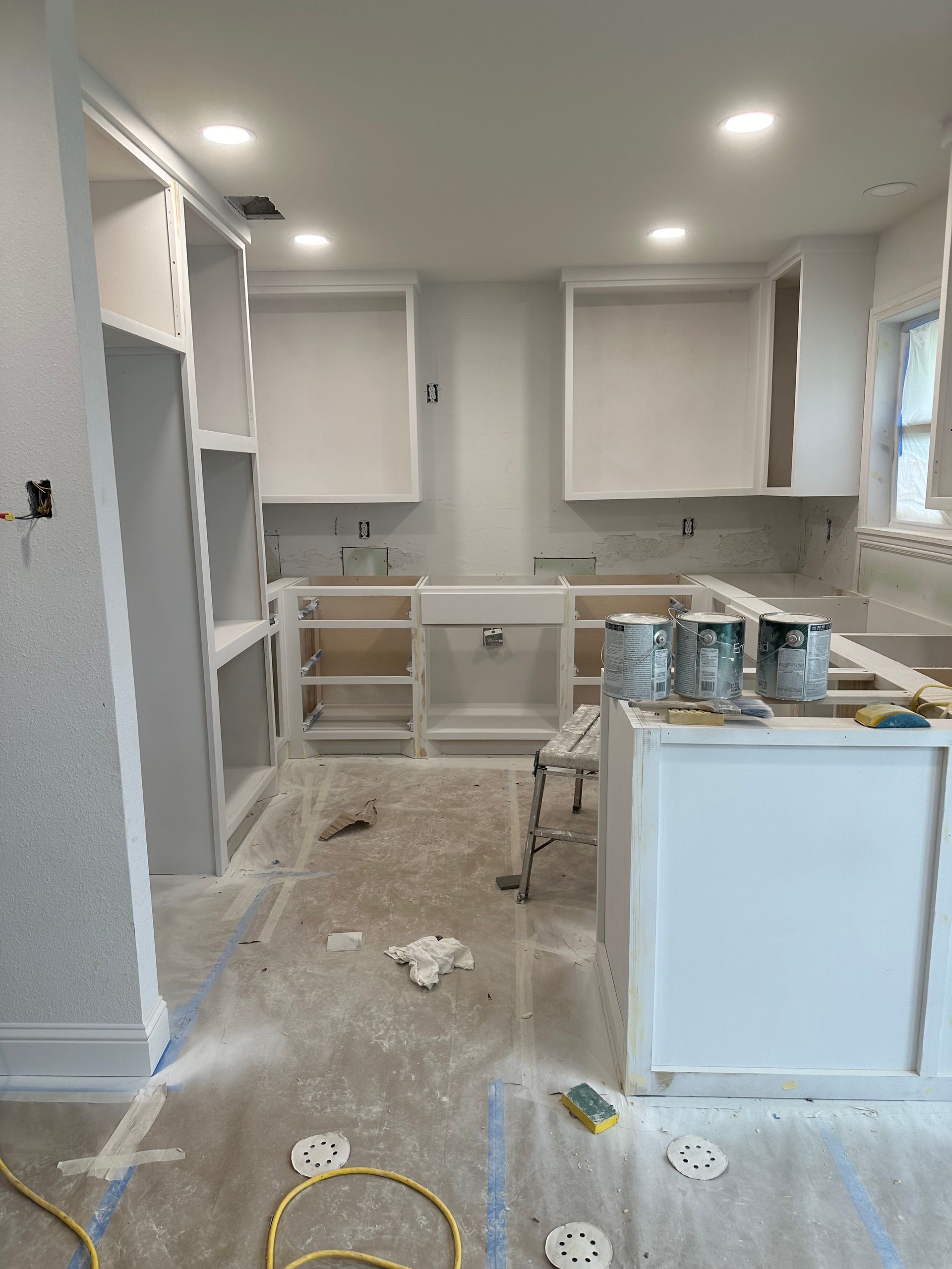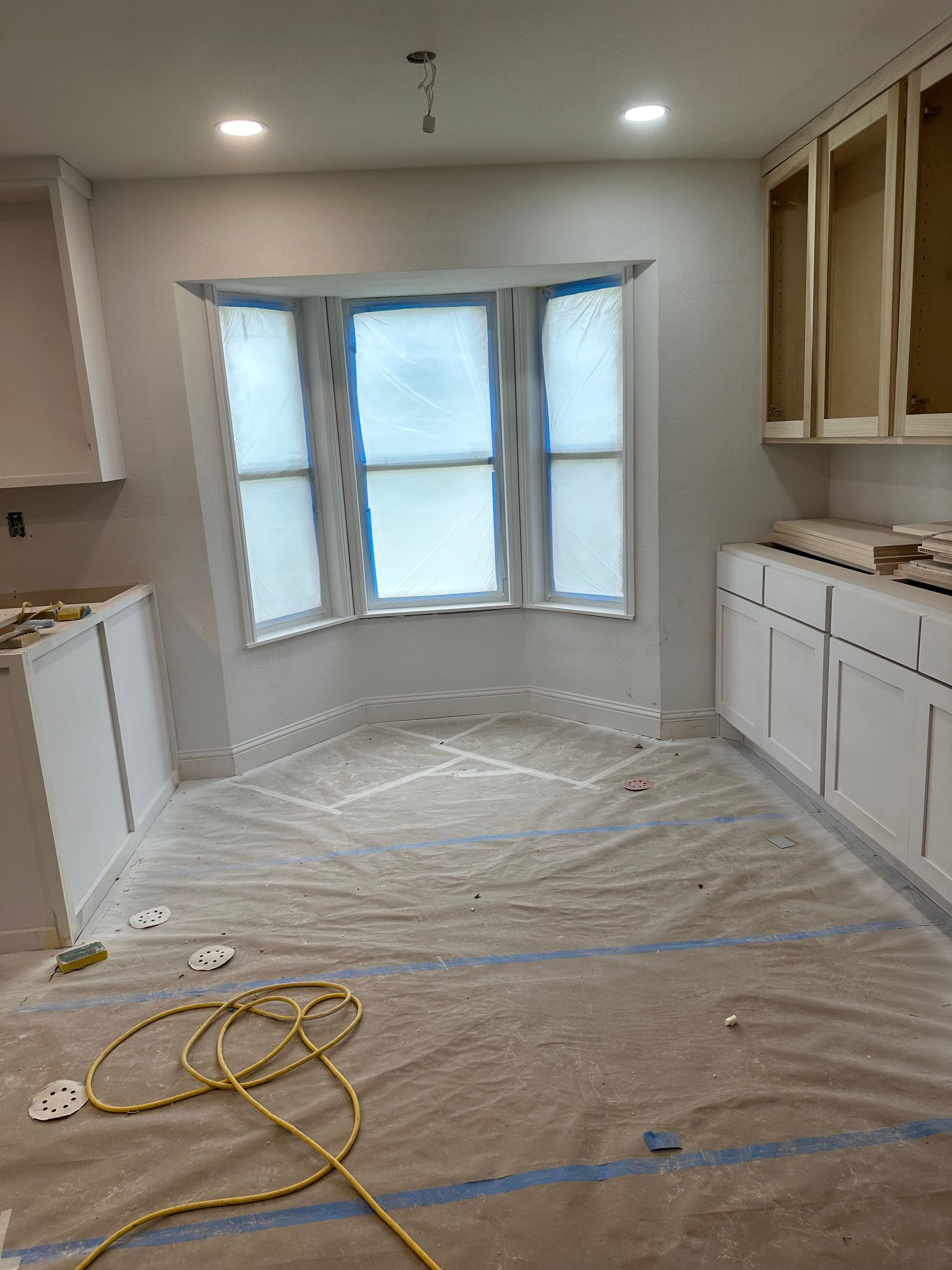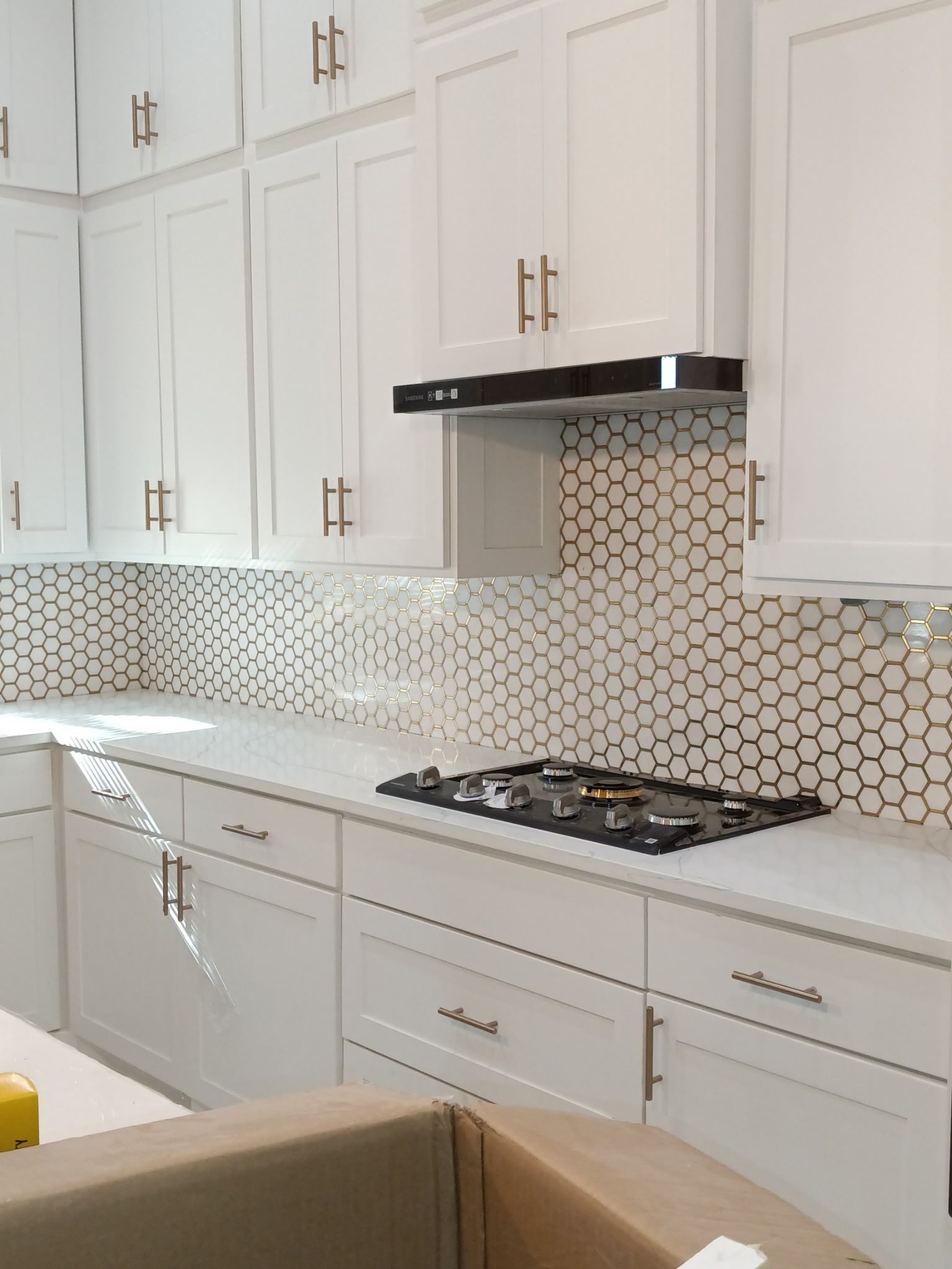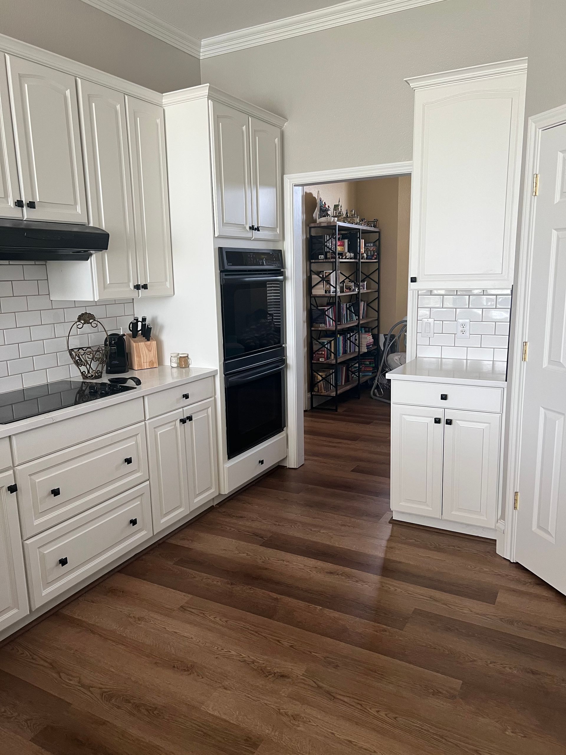 Kitchen remodel comparison: Before image shows wood cabinets, After image shows white cabinets, new backsplash, and appliances.