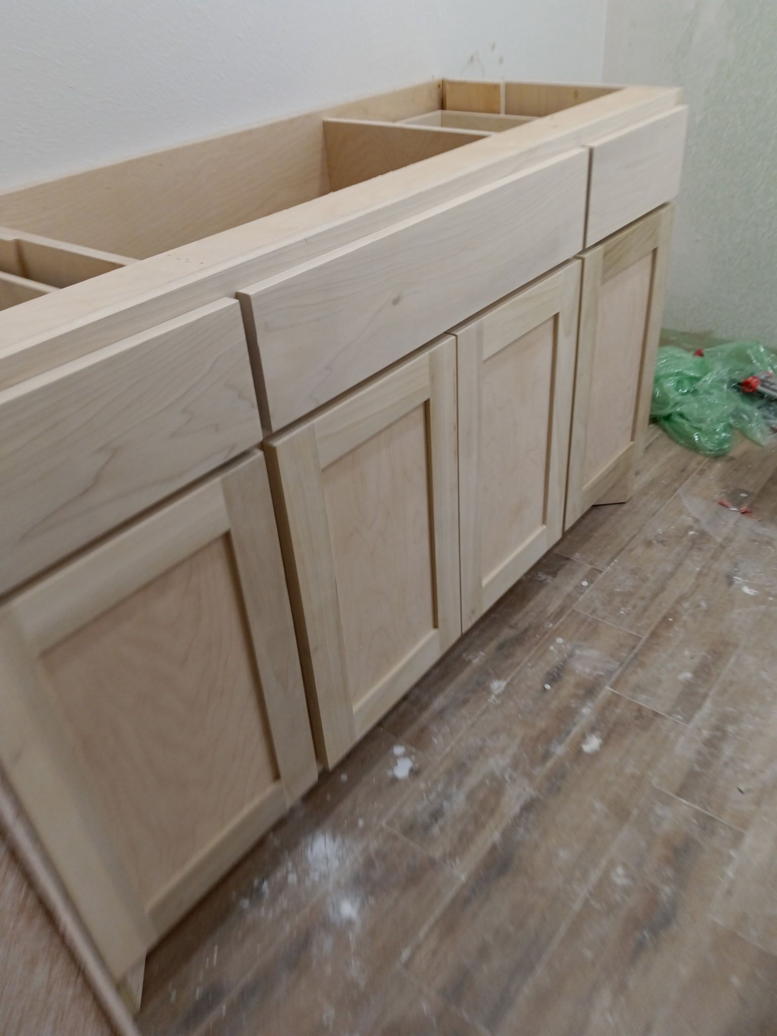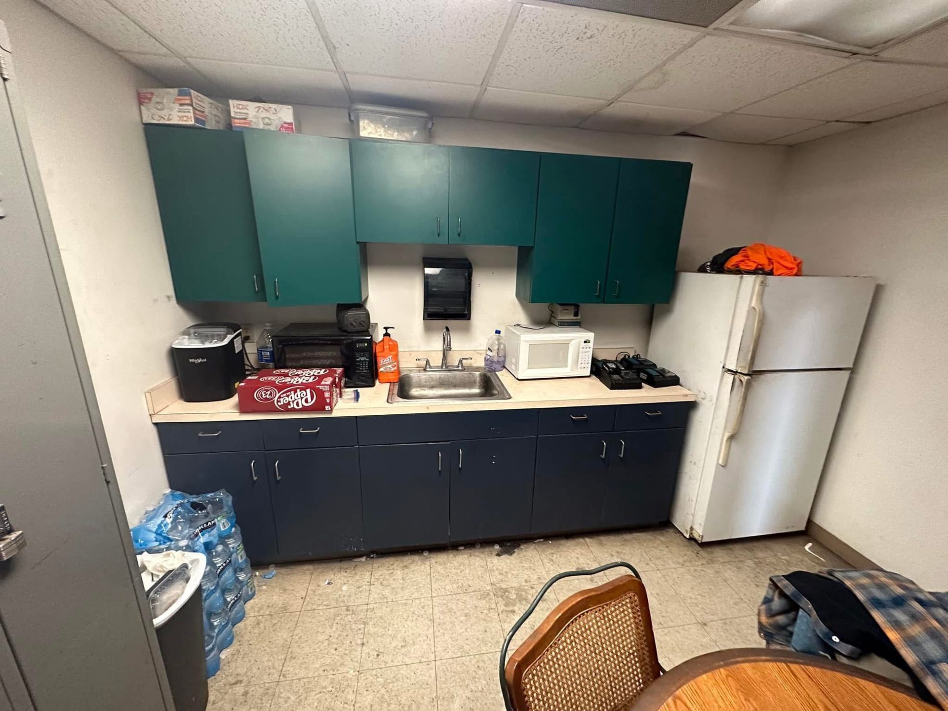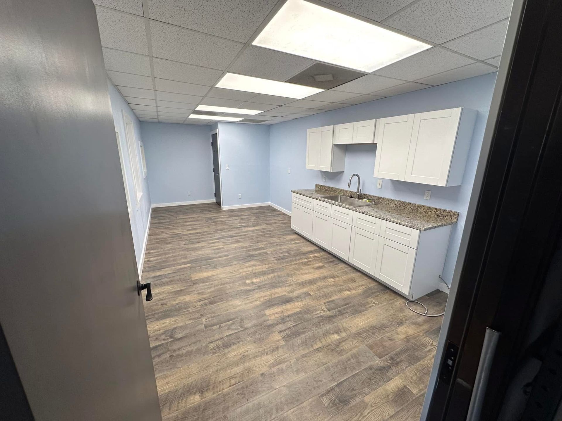 Two images show a commercial break room remodel with a sink, cabinets, and wood flooring.