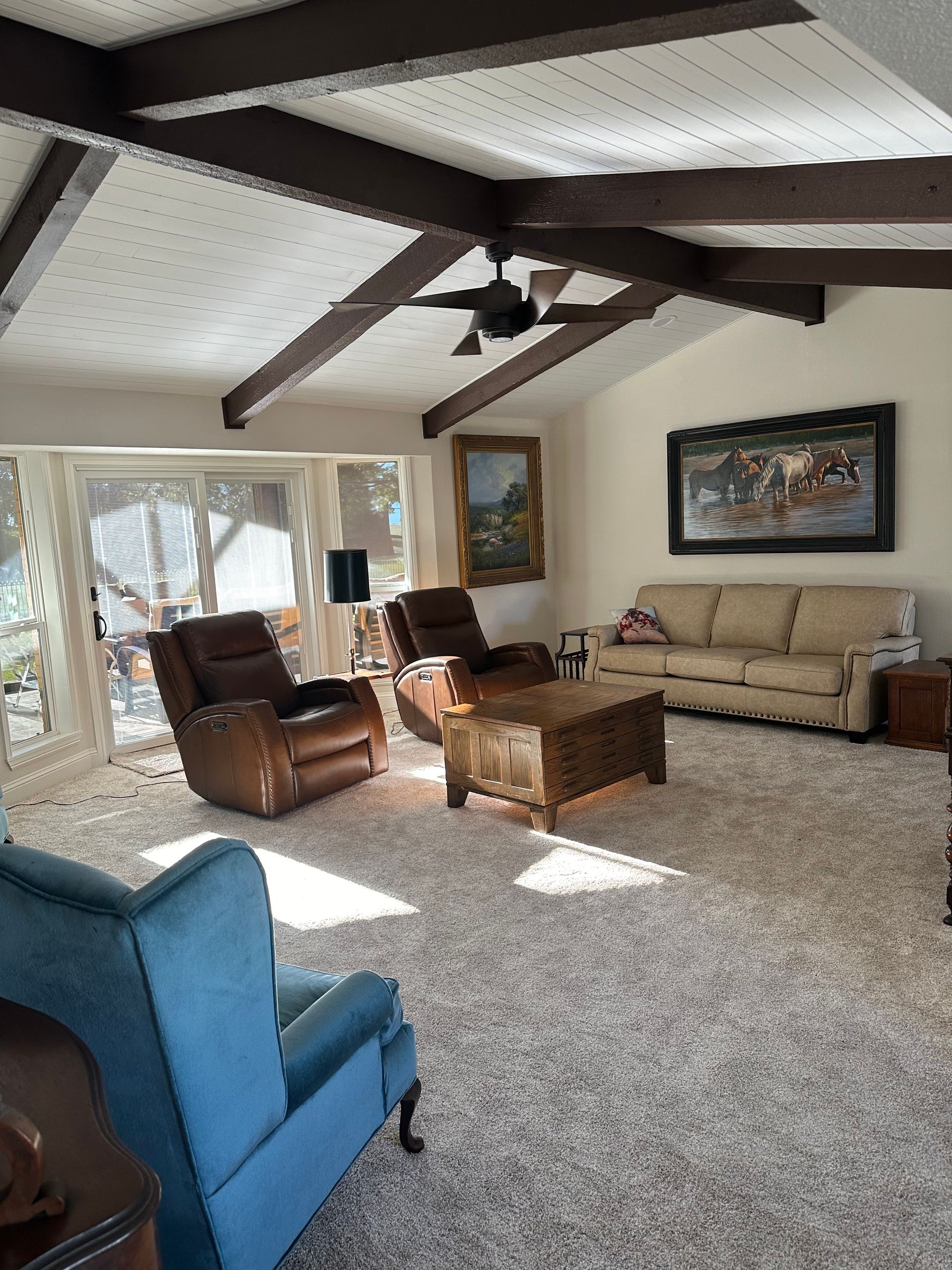 Spacious, light-filled room with shiny dark floors, gray walls, and several windows. A ceiling fan hangs overhead.