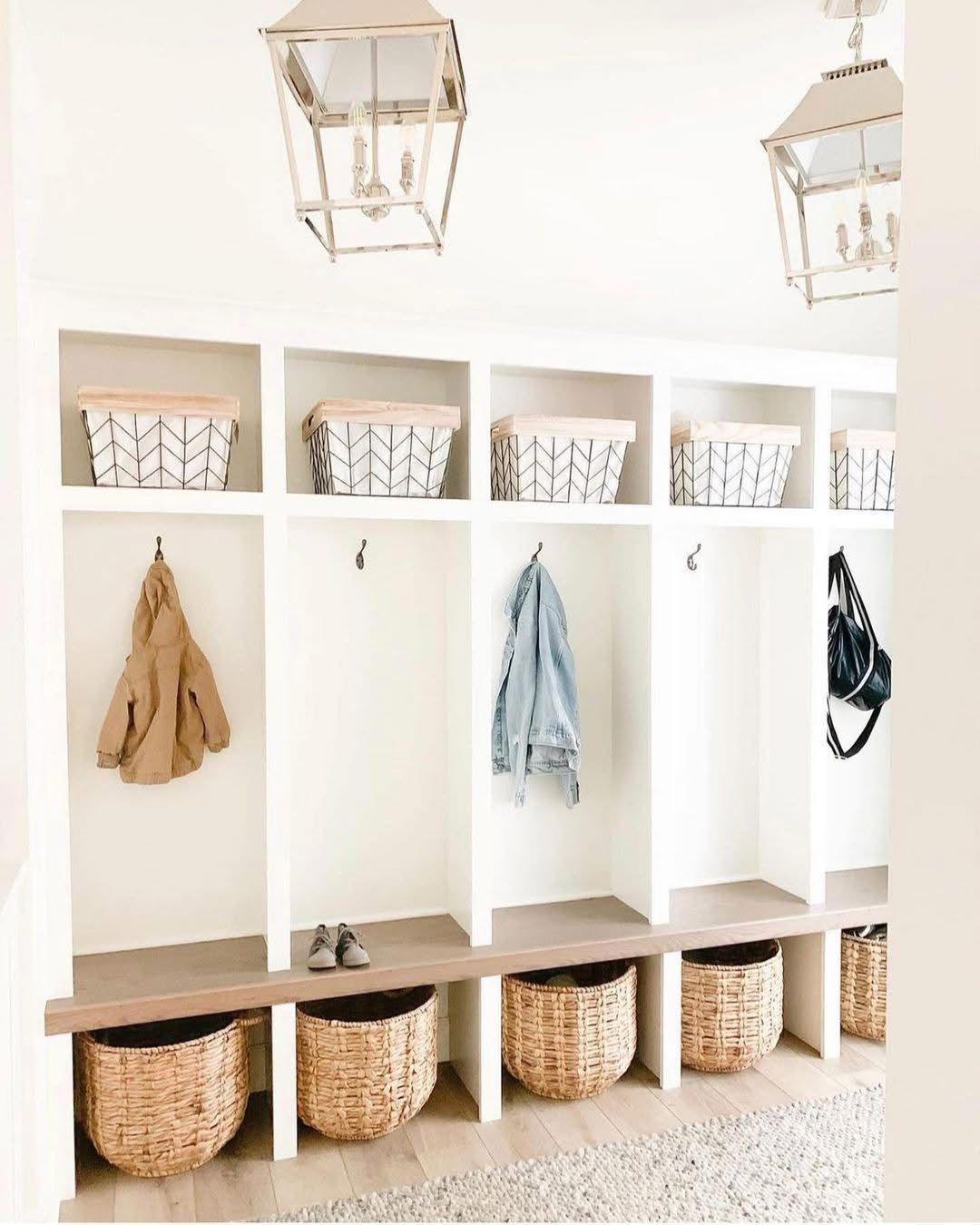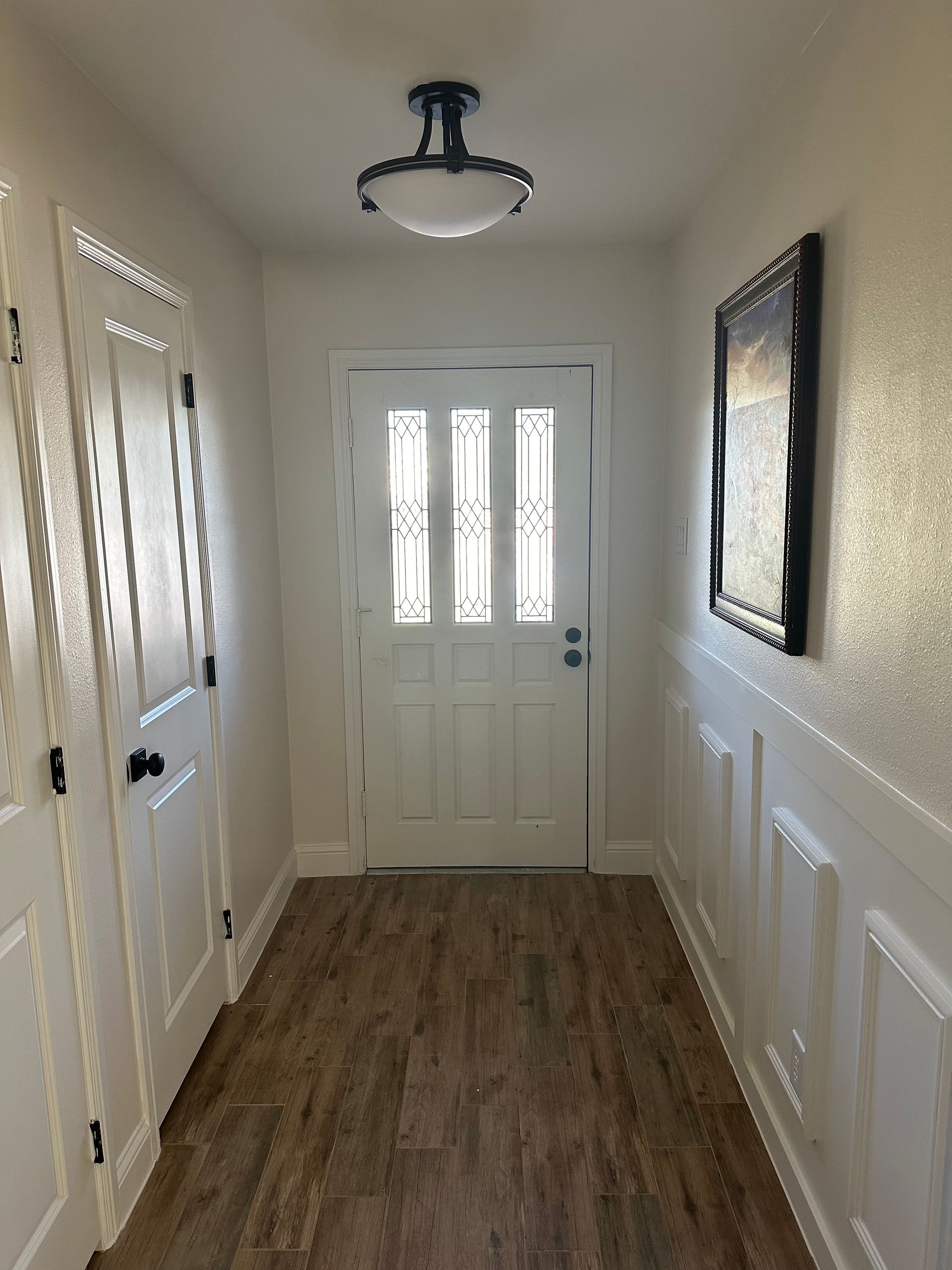 Room renovation before and after: bare room becomes a room with wood flooring, blue walls, white trim and ceiling.