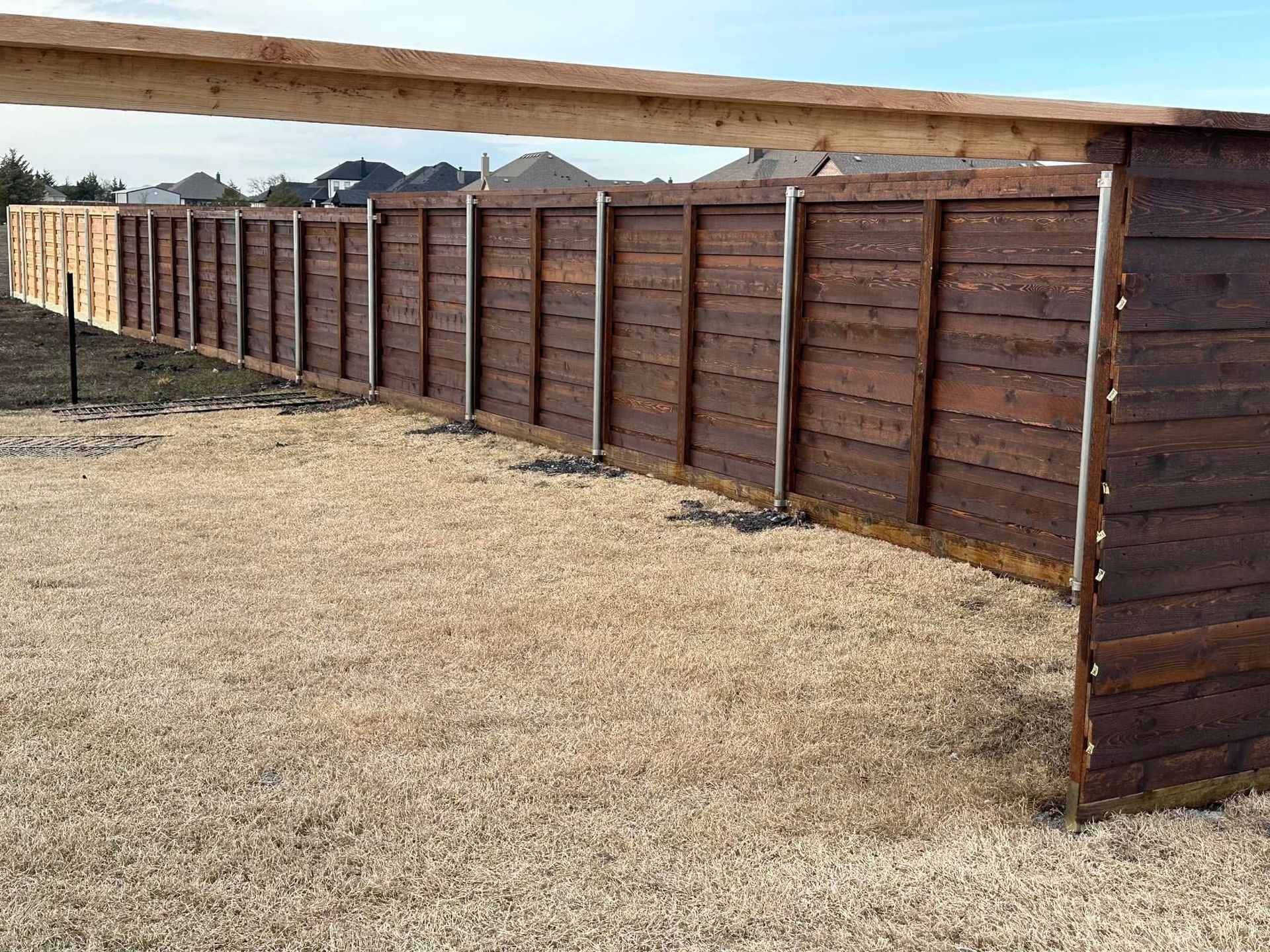 Long wooden privacy fence with steel posts; person in dark clothing walks along the side, cloudy sky above.