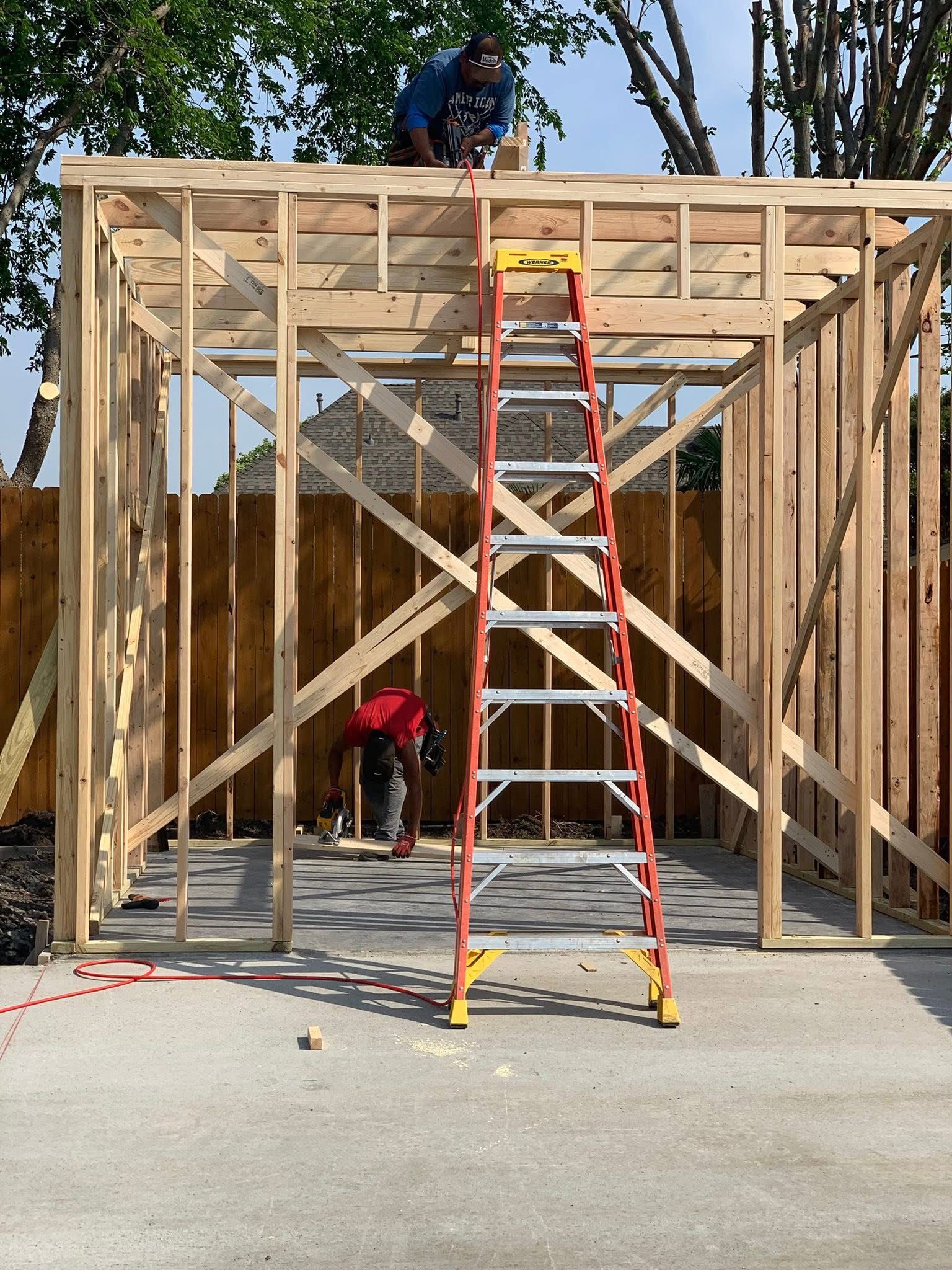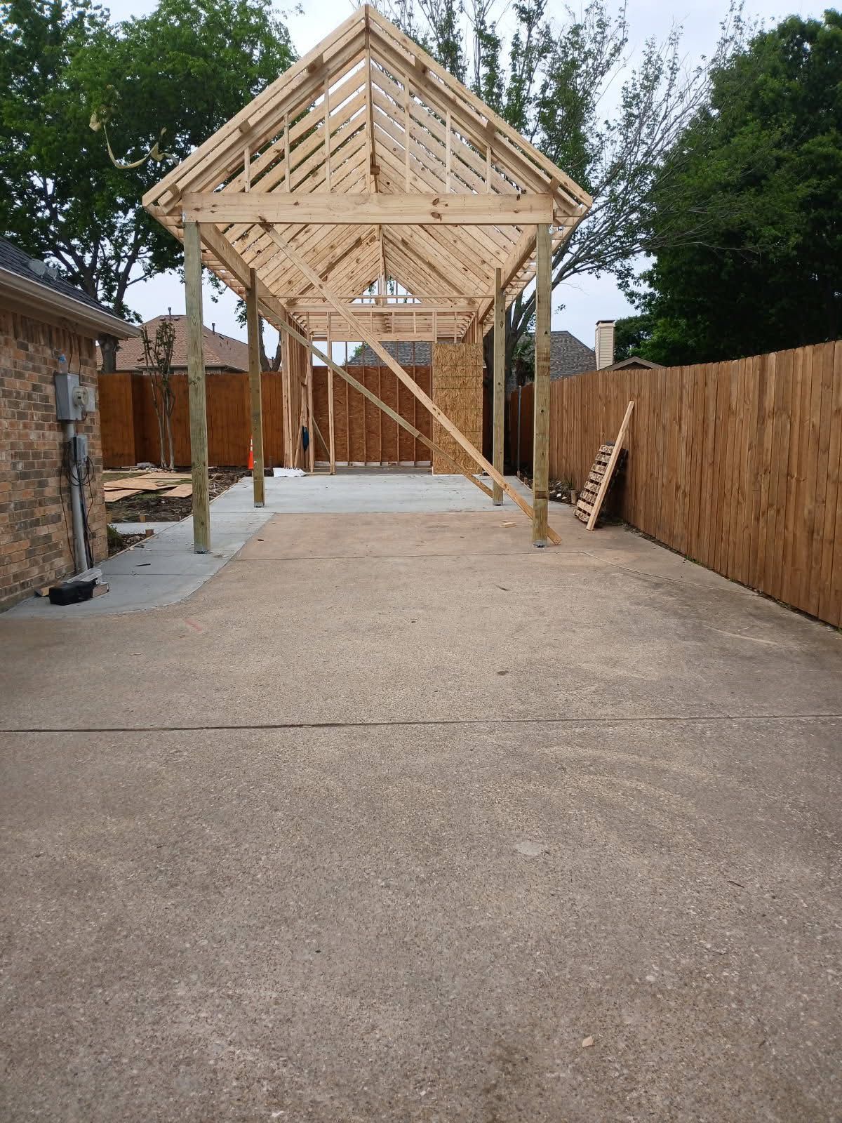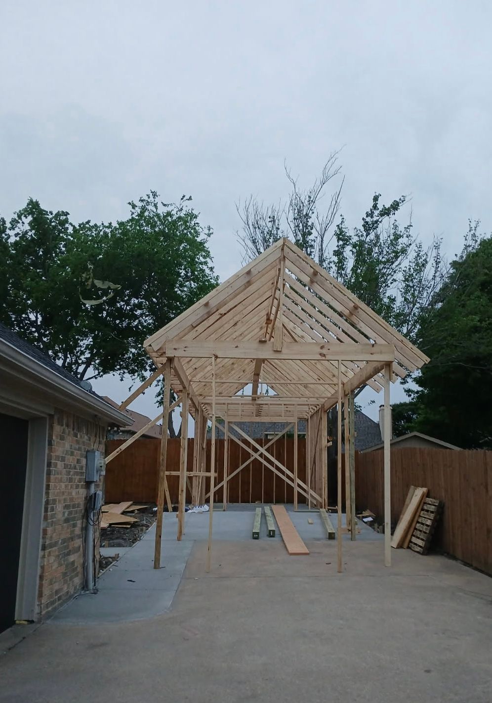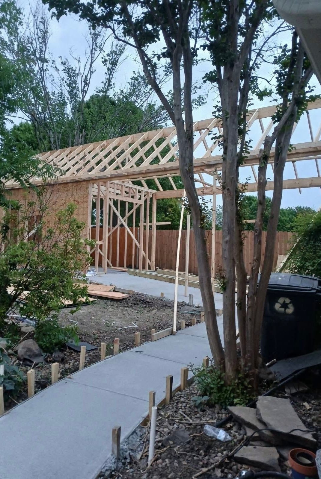 Construction of wooden wall studs on concrete floor, metal roof visible, outdoors.