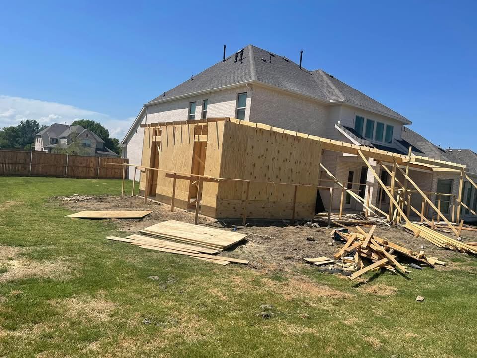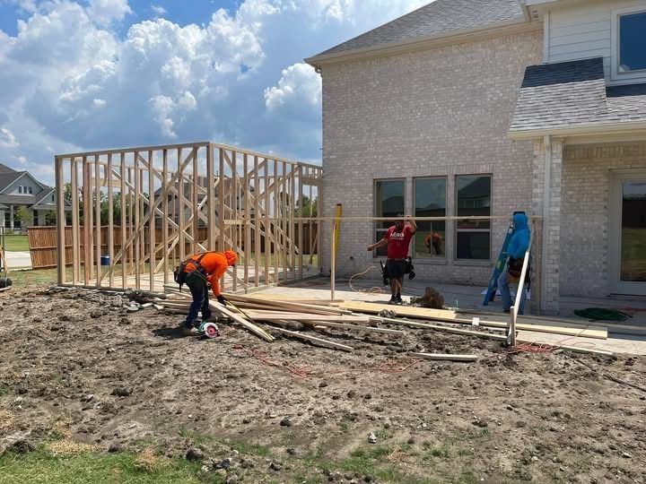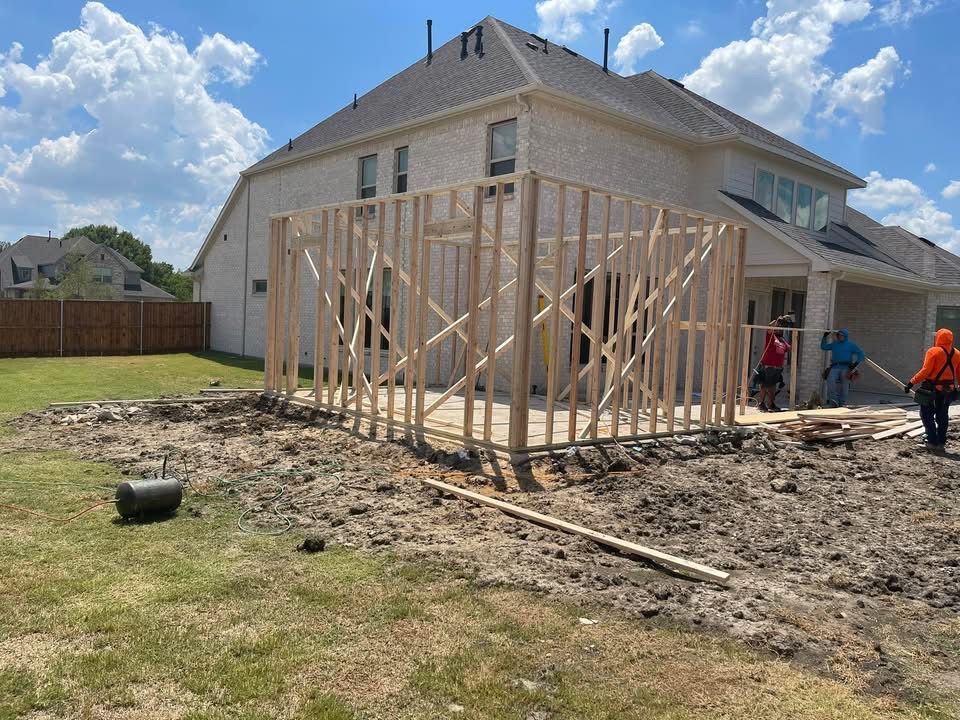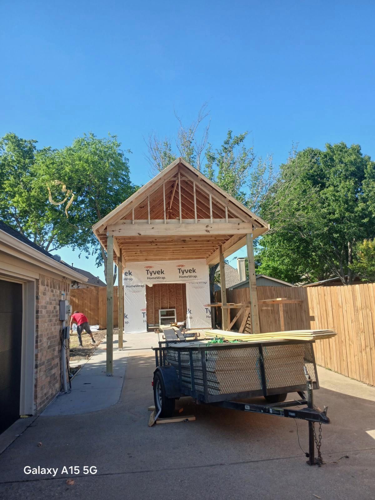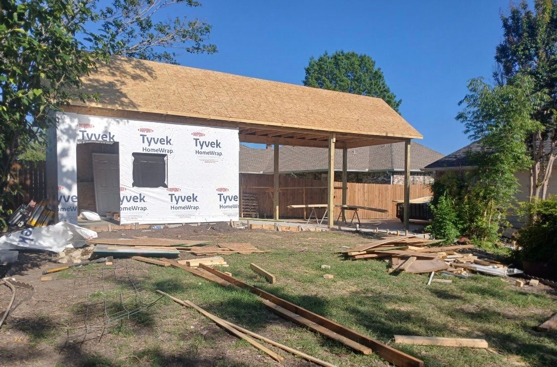 Construction of wooden wall studs on concrete floor, metal roof visible, outdoors.