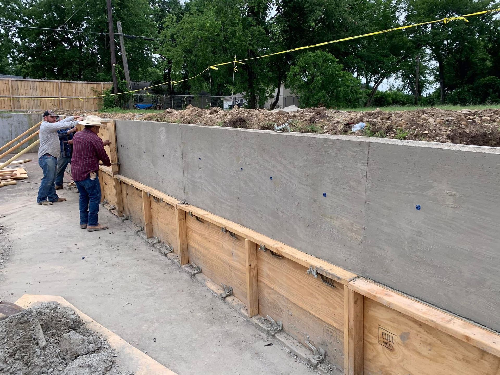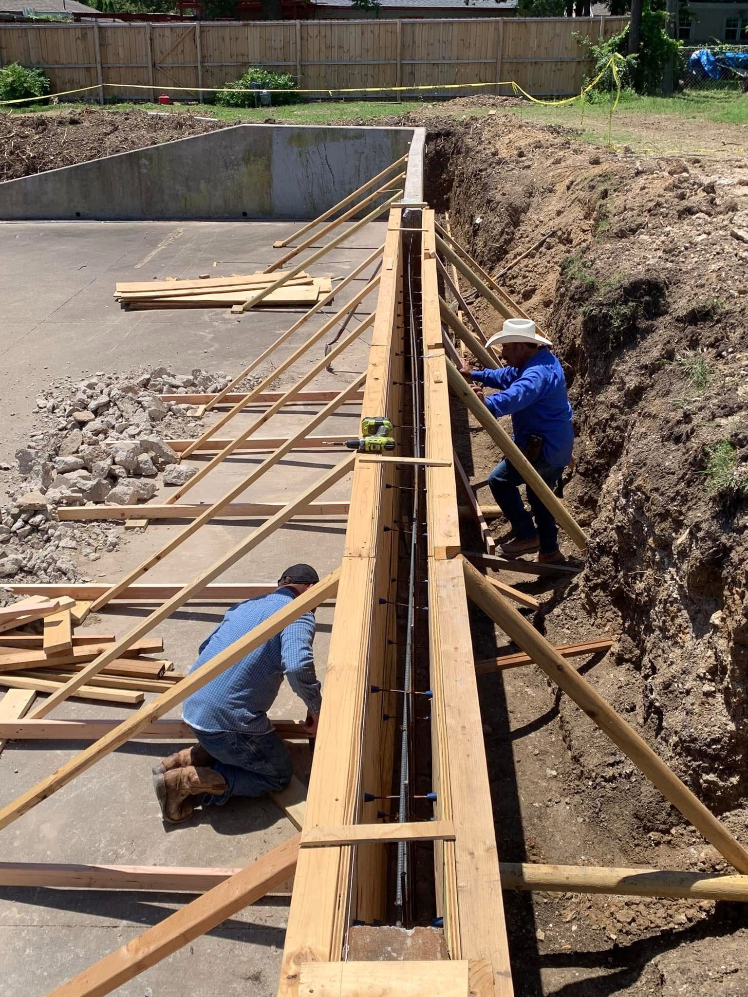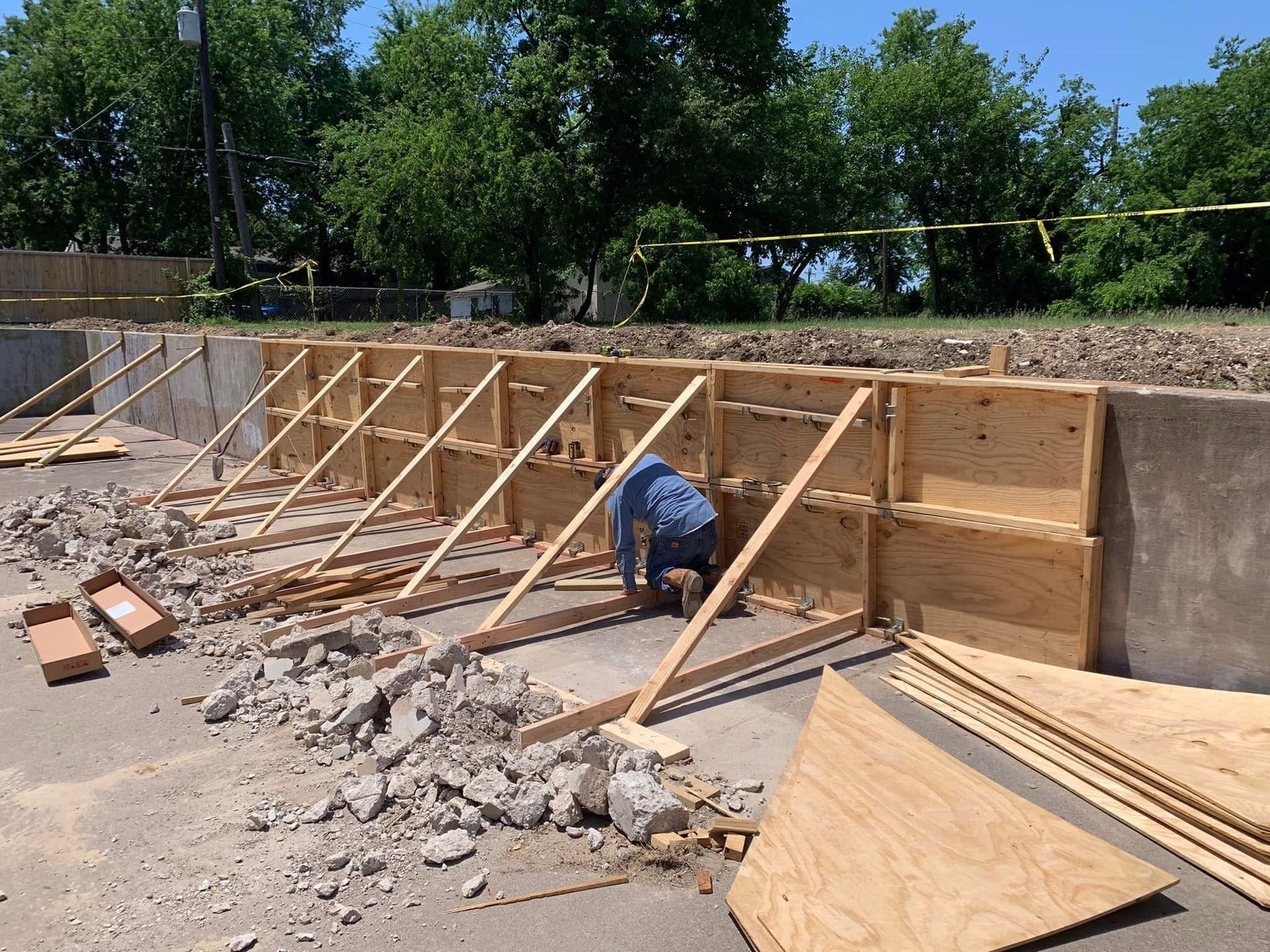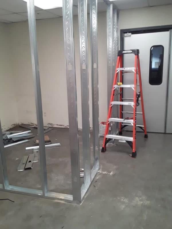 Construction of wooden wall studs on concrete floor, metal roof visible, outdoors.