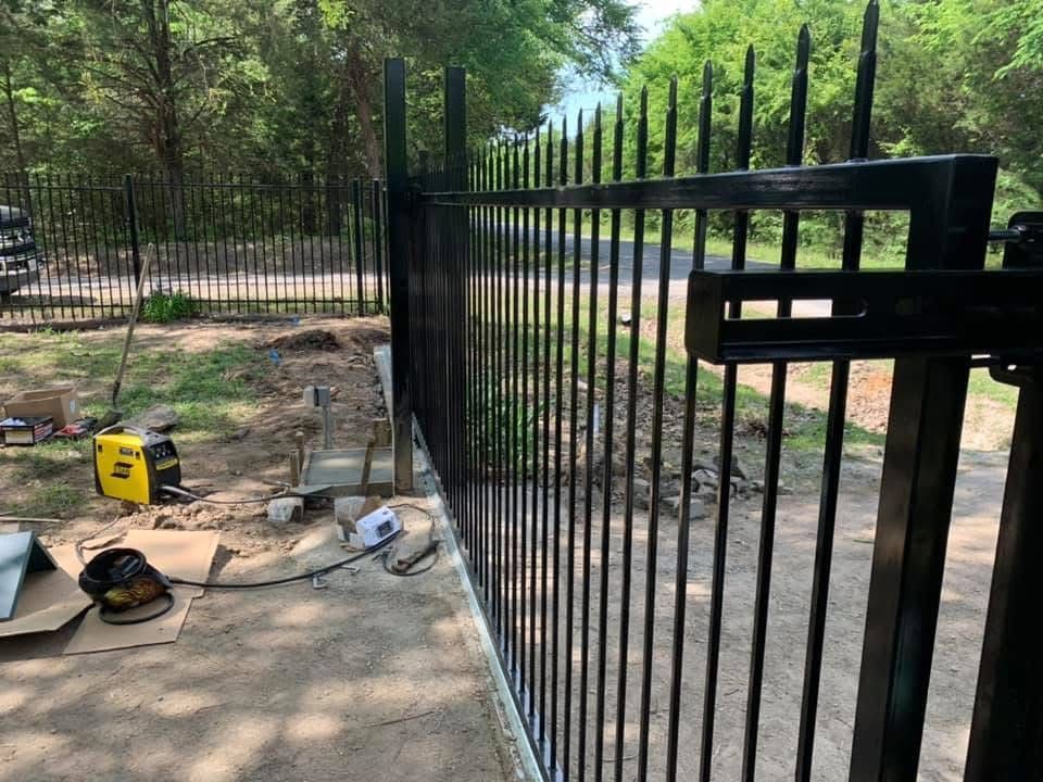 Black metal fence in front of a tall wooden fence, in an open field, under a cloudy sky.
