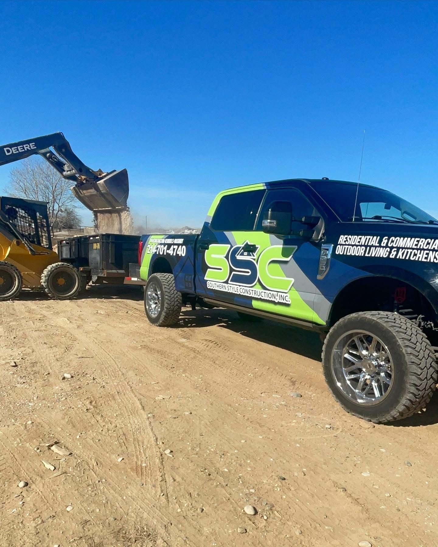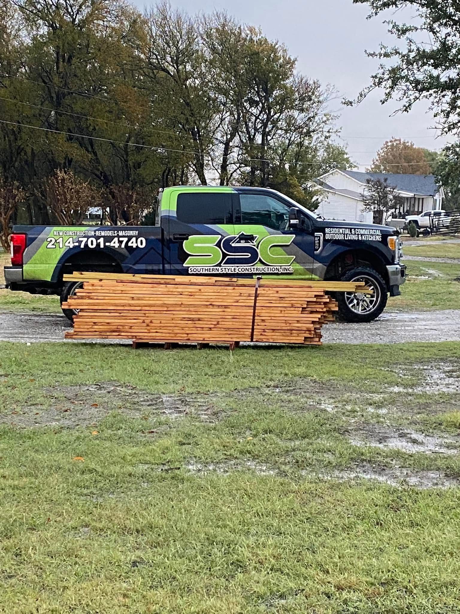 Logo for Southern Style Construction, Inc. with green and navy-blue stylized letters SSC, roof graphic, and tagline.