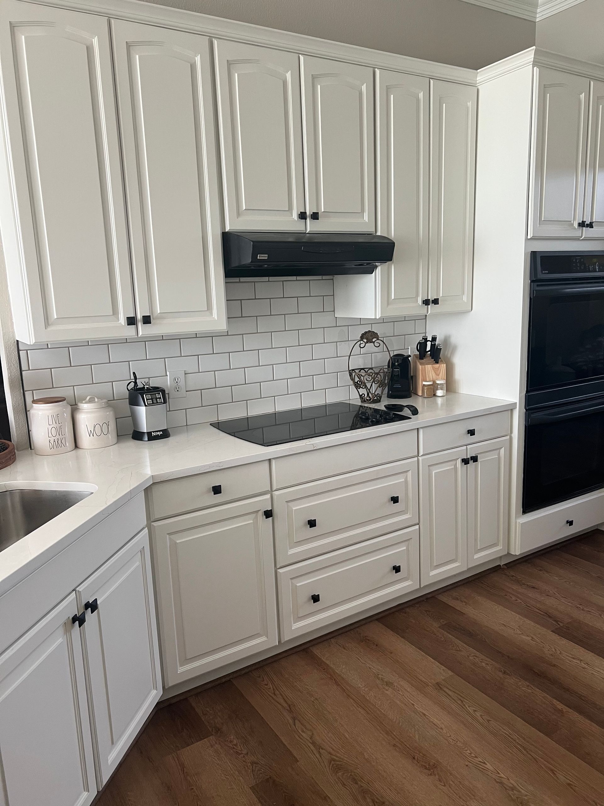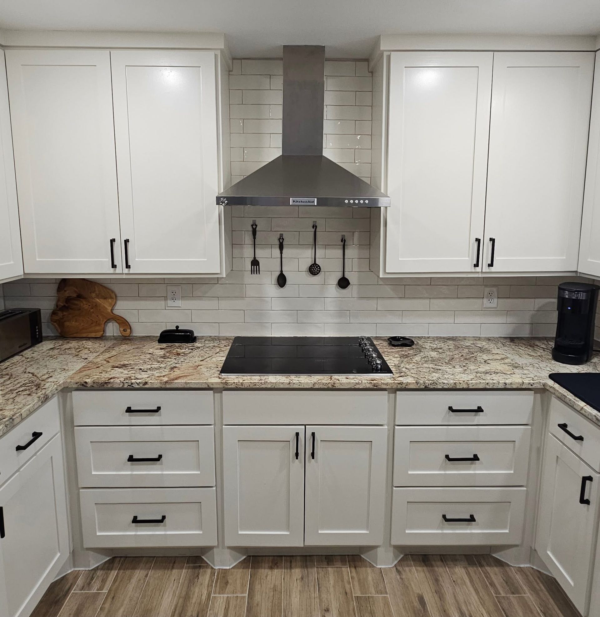 White kitchen cabinets with black hardware and a stainless steel range hood over a black stovetop.