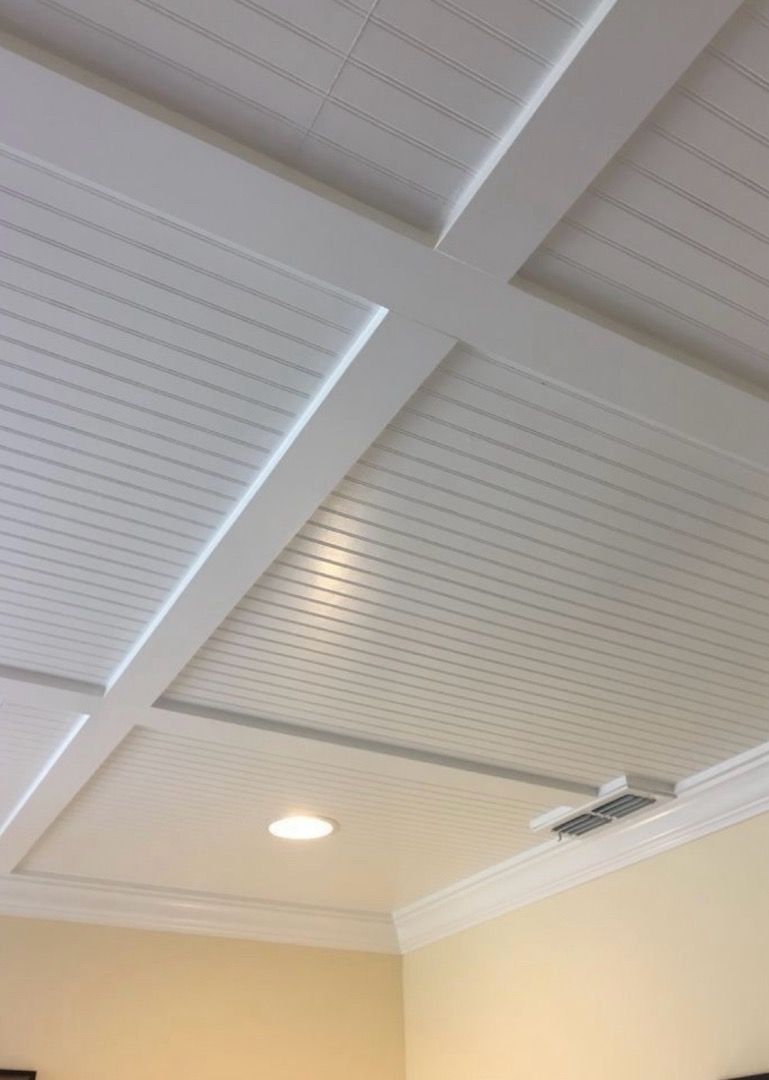 Wooden outdoor patio ceiling with a hanging ceiling fan, near a brick wall and trees.