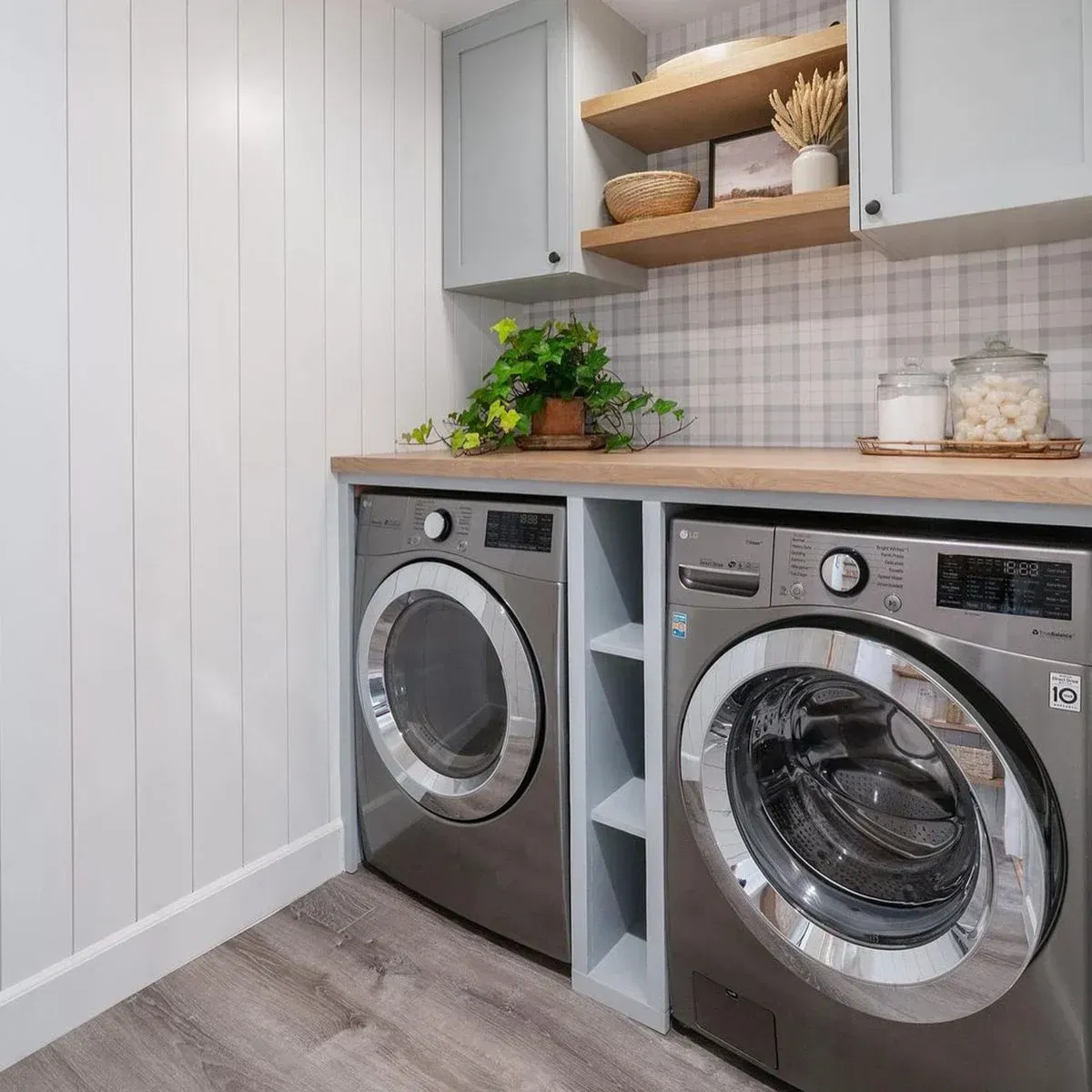Bathroom remodel comparison: before (brown cabinets, patterned wallpaper) and after (white cabinets, tiled shower).