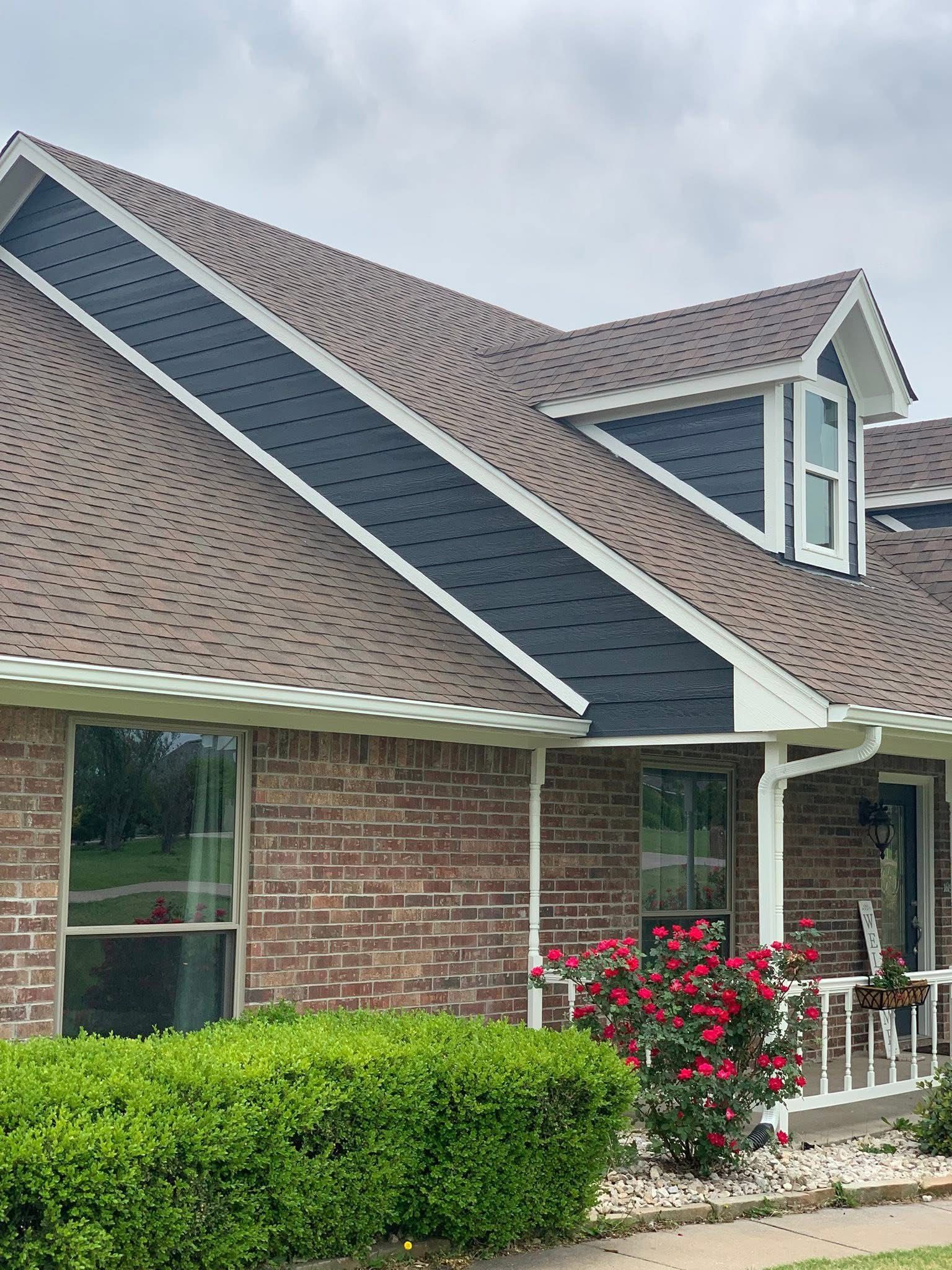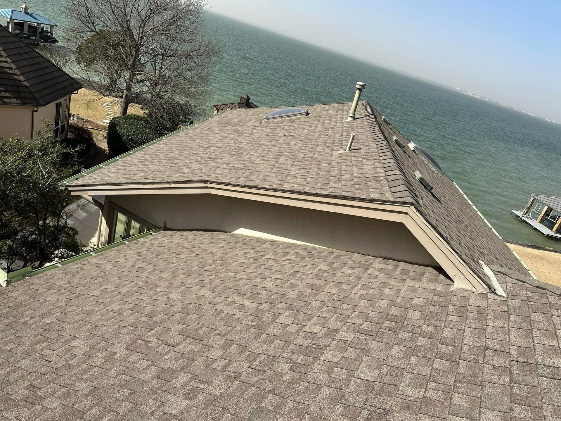 Roofers installing asphalt shingles on a multi-gabled roof against a blue sky.