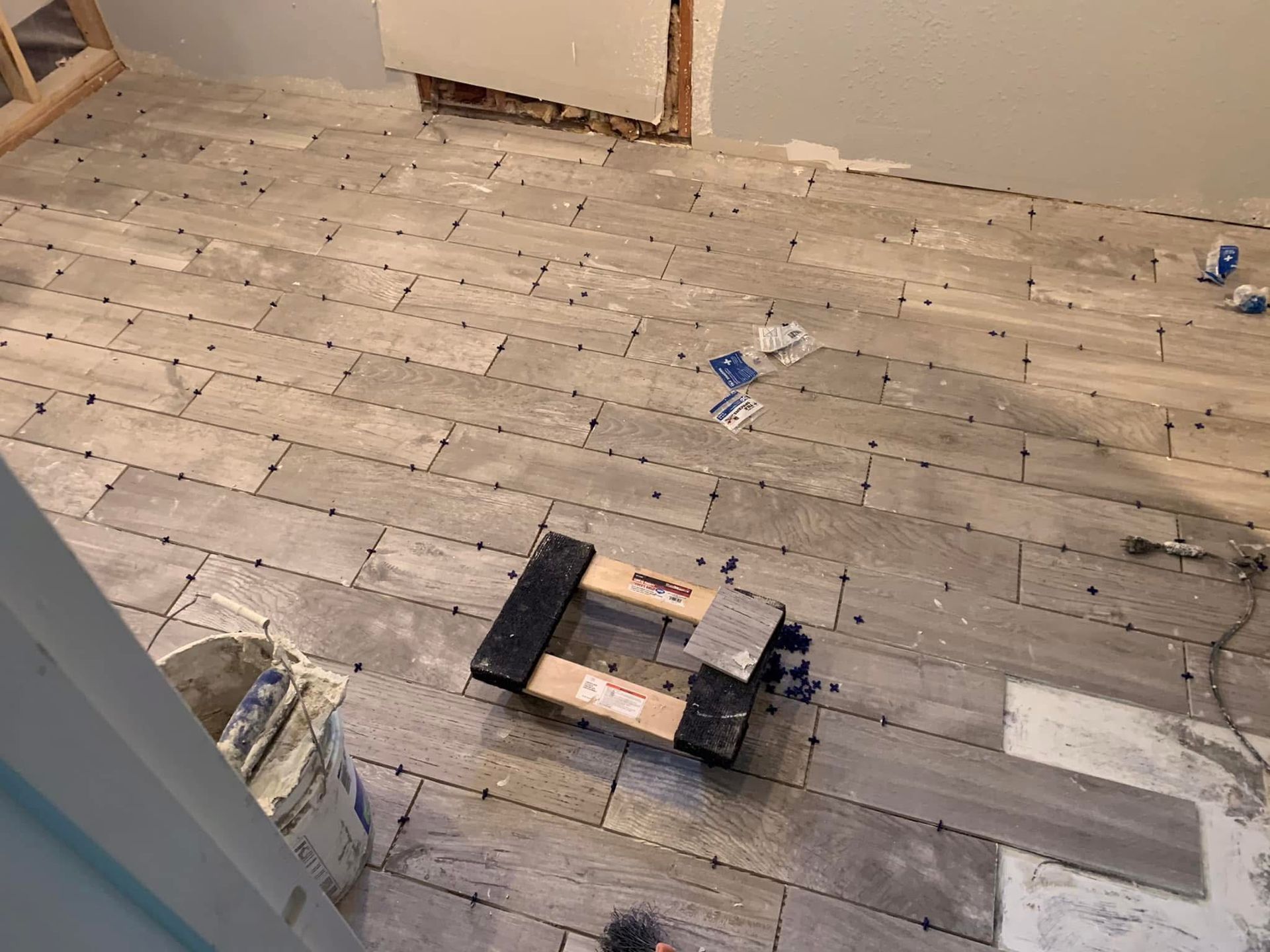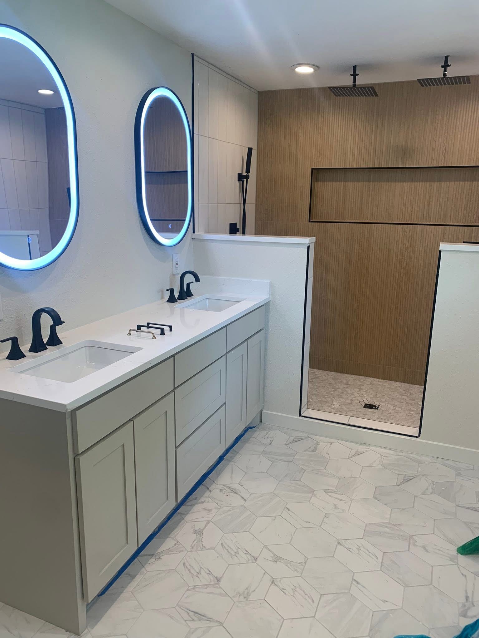 Modern bathroom with white vanity, oval mirror, walk-in shower with brown wood-look tile.