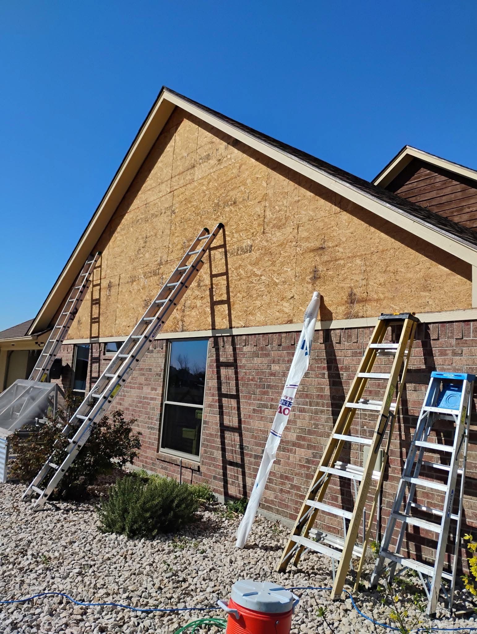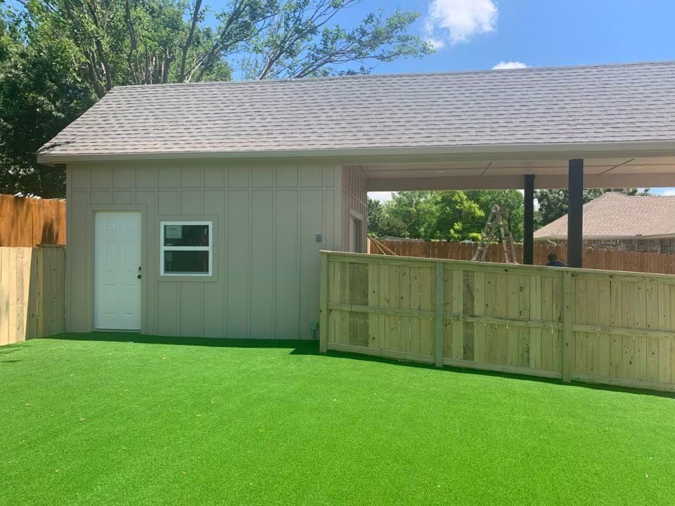 Top: unfinished wooden fence frame along a house. Bottom: completed wooden fence. Cloudy sky.