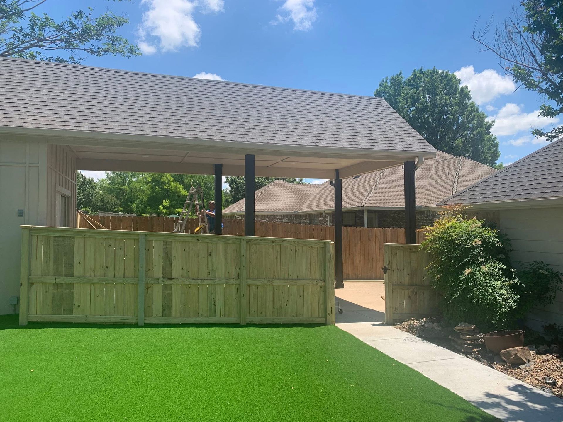 Wooden fence with gate, enclosing a grassy yard. A curved sidewalk leads toward the gate.