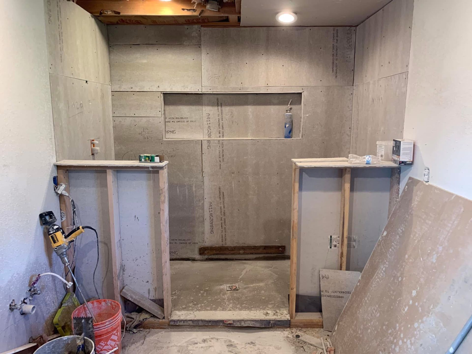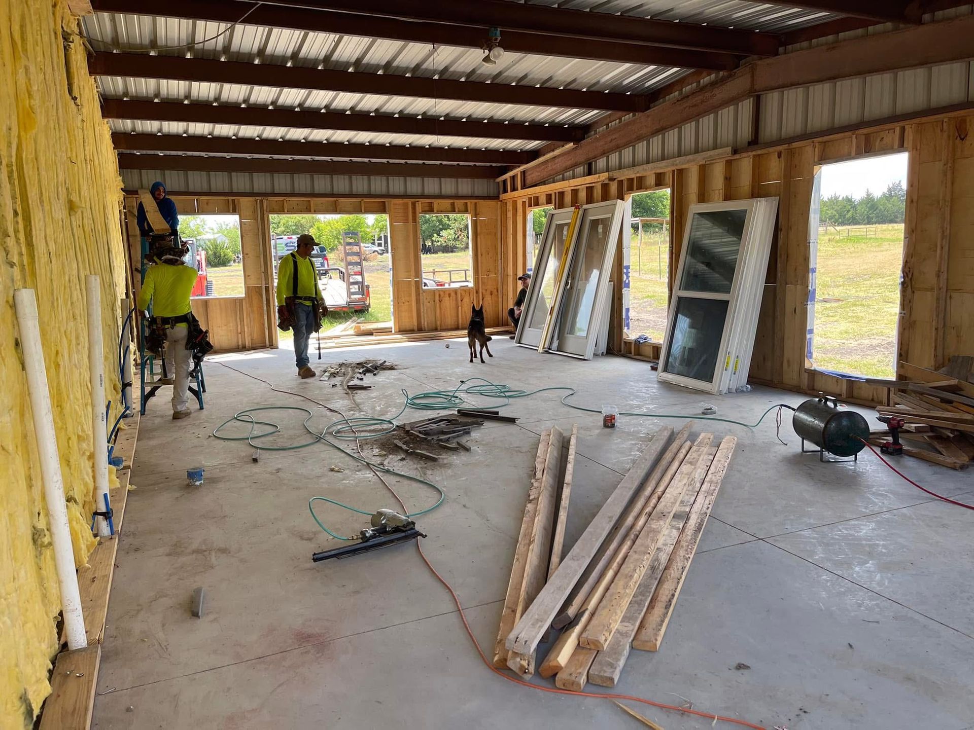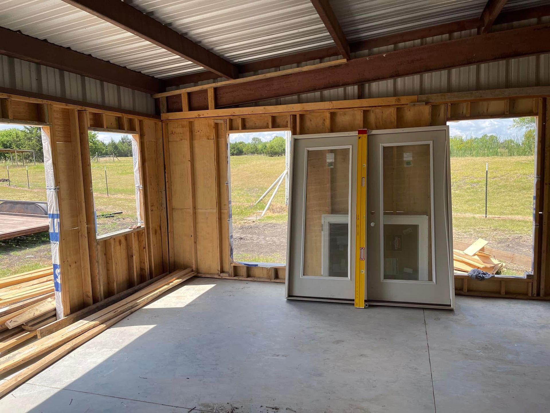 Interior of a building under construction, wood framing and concrete floor, with doors and windows.