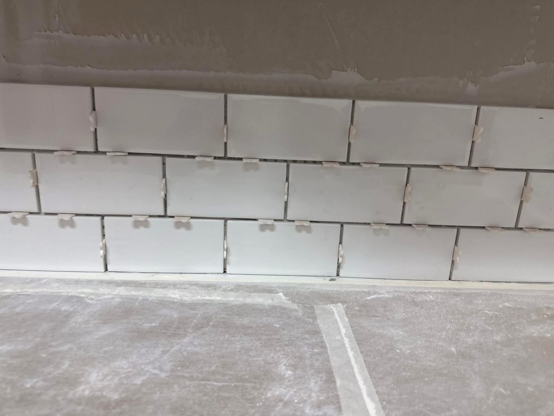 Modern bathroom with white tiled shower stall, glass divider, and arched window.