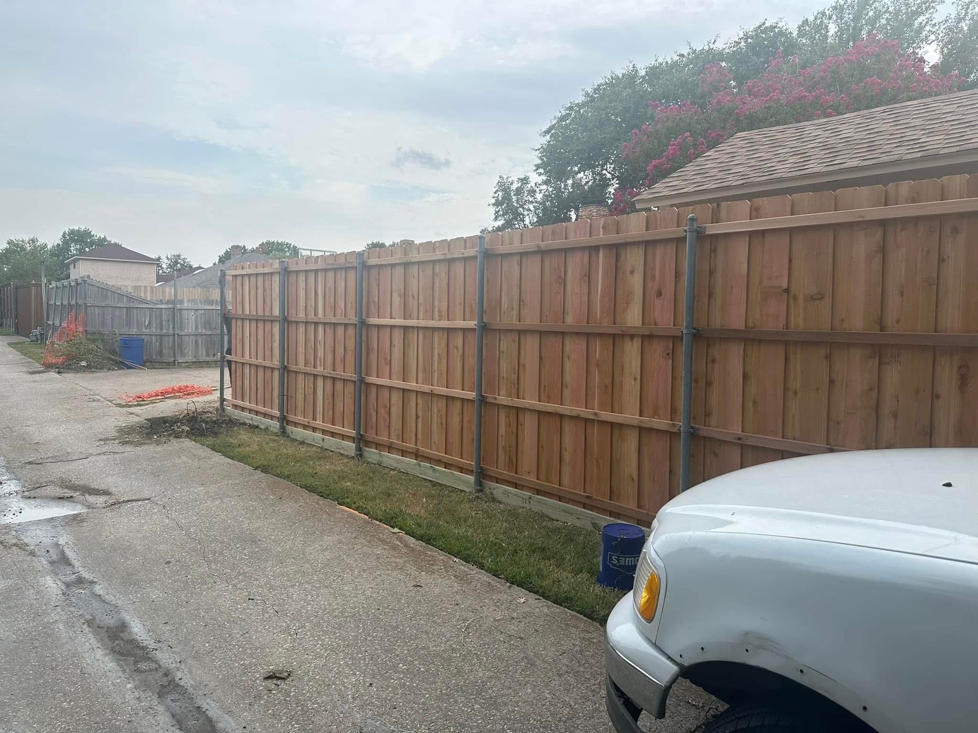 Wooden fence with a matching lower fence in front, set against asphalt.